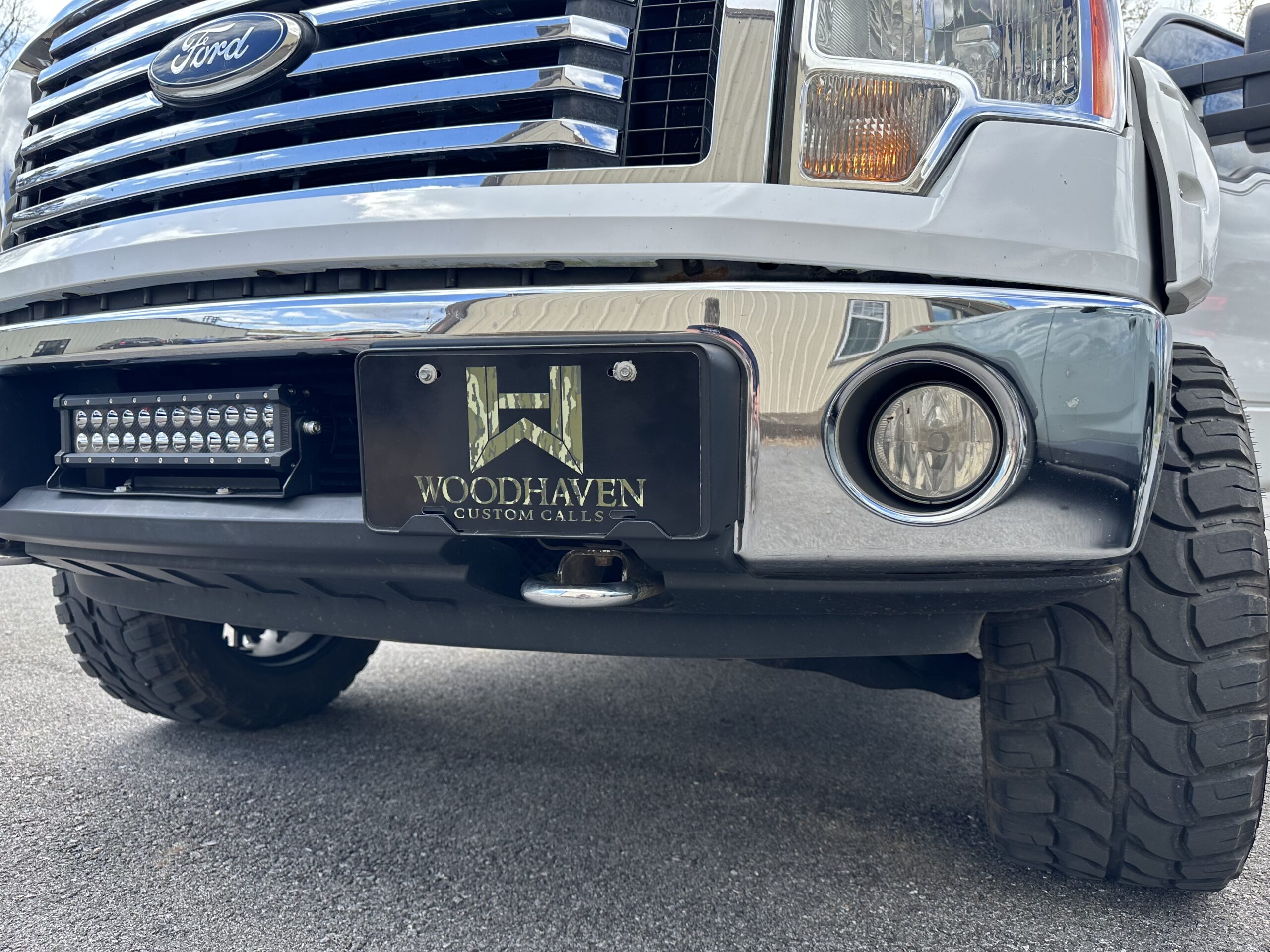 Black aluminum license plate with Woodhaven logo in Mossy Oak Bottomland