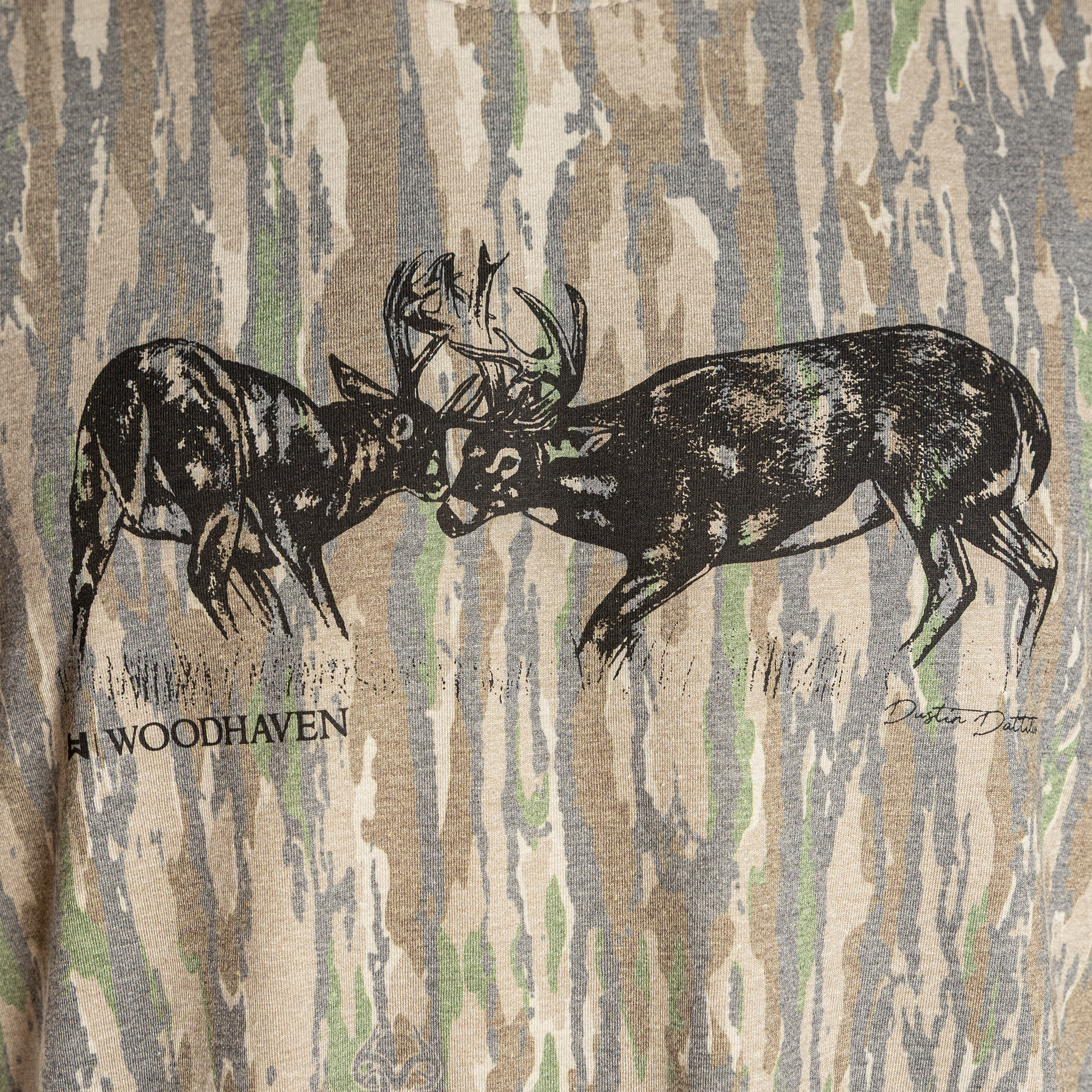 Two whitetail bucks meet head-to-head. The Lockup is crafted from a 50% Polyester / 25% Cotton / 25% Rayon tri-blend for a premium feel and lasting comfort. Featuring the iconic Realtree® Original pattern and original artwork by Dustin Dattilio.