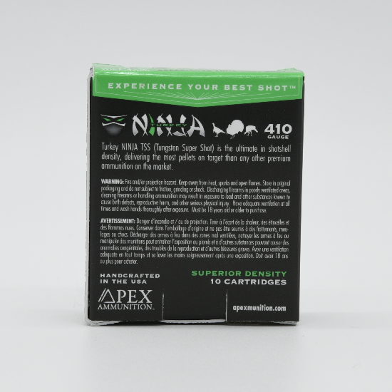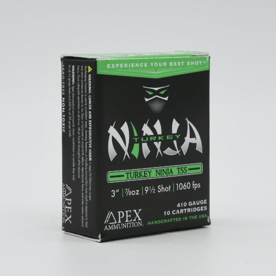 The APEX “Turkey Ninja” line will feature the #8.5 TSS shot and will be available for 3 & 3 1/2 inch 12 gauge, 20 Gauge and 28 Gauge. .410 ammunition will also be offered as well within the “Turkey Ninja” line but will be loaded with a 7/8oz load of #9.5 TSS shot. The heaviest .410 payload ever introduced in the industry.